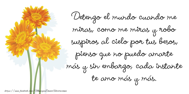 Detengo el mundo cuando me miras, como me miras y robo suspiros al cielo por tus besos, pienso que no puedo amarte más y sin embargo, cada instante te amo más y más.