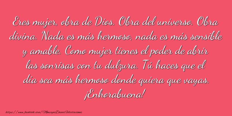 Eres mujer, obra de Dios. Obra del universo. Obra divina. Nada es más hermoso, nada es más sensible y amable. Como mujer tienes el poder de abrir las sonrisas con tu dulzura. Tú haces que el día sea más hermoso donde quiera que vayas. ¡Enhorabuena!