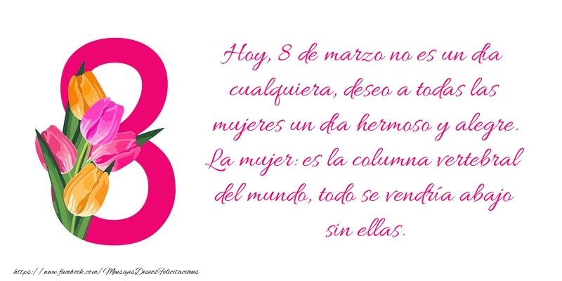 Hoy, 8 de marzo no es un día cualquiera, deseo a todas las mujeres un día hermoso y alegre. La mujer: es la columna vertebral del mundo, todo se vendría abajo sin ellas.